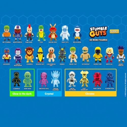 Оживіть дивовижних 3D-героїв з популярної гри Stumble Guys! Який персонаж Вам більше до вподоби? У цій серії Ви можете знайти мегалодона, анубіса, капітана Золоте серце, лучадора та багато інших цікавих героїв! Вони ідеально підходять для колекціонування та веселих ігор. Зберіть їх усіх!